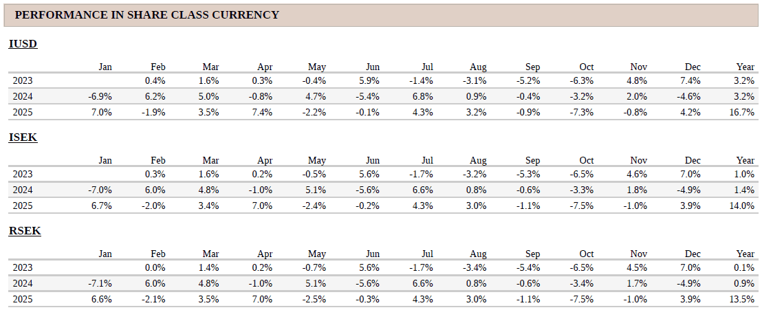 Note that the information below describes the share class (I USD), which is a share class reserved for institutional investors. Investments in other share classes generally have other conditions regarding, among other things, fees, which affects the share class return. The information below regarding returns therefore differs from the returns in other share classes.