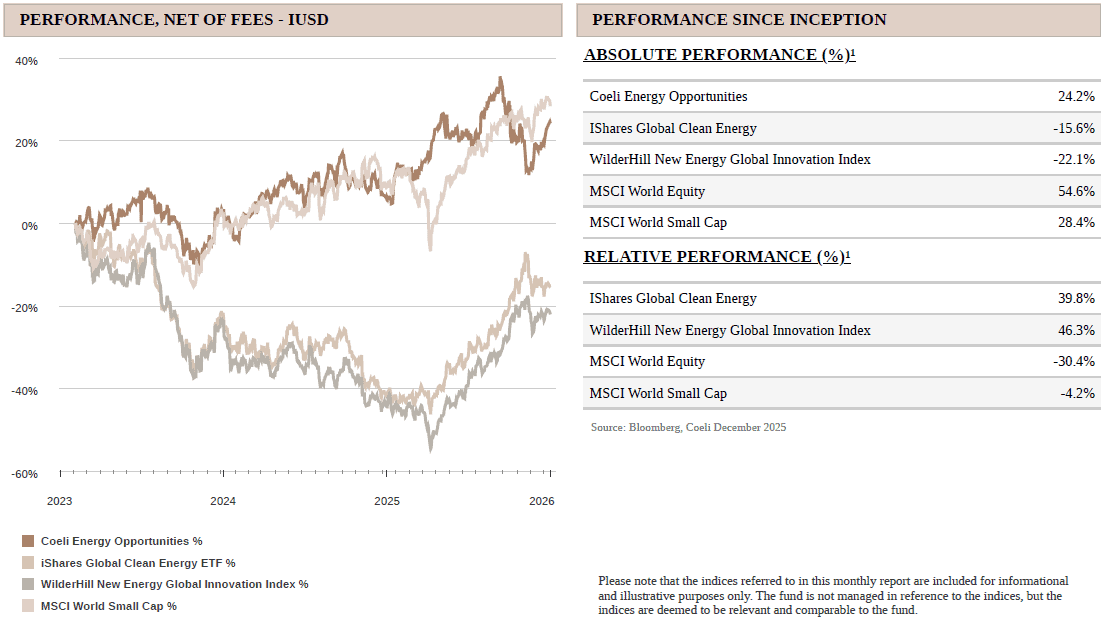 The Coeli Energy Opportunities fund rose 4.2% net of fees and expenses in December (I USD share class). It gained 16.7% during the year and has returned 24.2% since inception in February 2023.