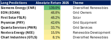 ‘Diversified Renewables’ was the strongest theme for the year, with several of the largest contributors to absolute performance. In last year’s outlook, we highlighted Siemens Energy (ENR) as a top pick despite a 320% return in 2024 and a rich 70x 2025 P/E multiple. However, as we expected, consensus estimates were too low and during the year, 2025 earnings estimates were revised up by more than 100%, while 2026 and 2027 EPS estimates were increased by 68% and 74%, respectively. The share price appreciated 139% over the year, supported by well-deserved multiple expansion as 2028-2030 estimates were raised even further.