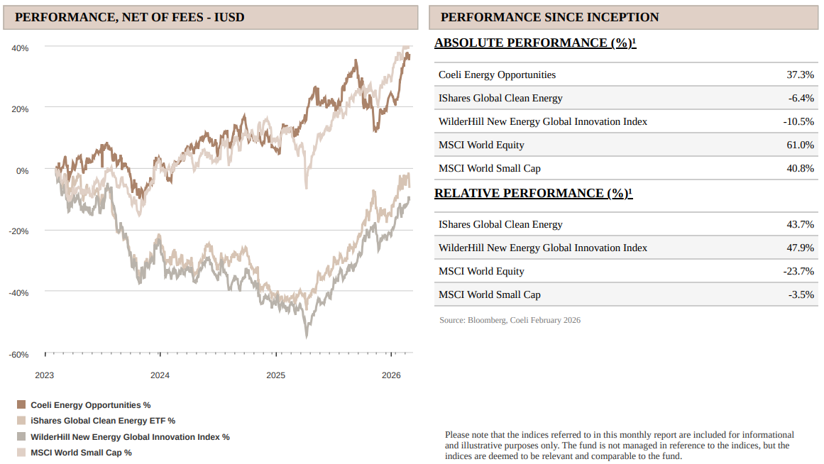 The Coeli Energy Opportunities fund gained 6.1% net of fees and expenses in February (I USD share class). Year-to-date, the fund is up 10.6% and it has gained 37.3% since inception in February 2023.