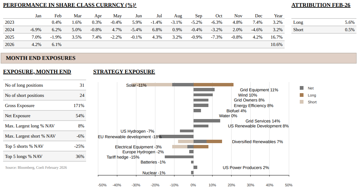 In a volatile month with significant dispersion between stocks and sub-sectors, the fund gained 5.6% on long positions, while shorts added 0.5%. More than two thirds of the themes delivered positive returns, led by ‘powering AI’ related themes, where two of our largest positions, Siemens Energy (ENR) and Mastec (MTZ), both rose on strong earnings. The ‘Wind’ theme also performed well, adding 1.7% to NAV, as Nordex (NDX1) rose 28% in February following solid results and raised guidance.