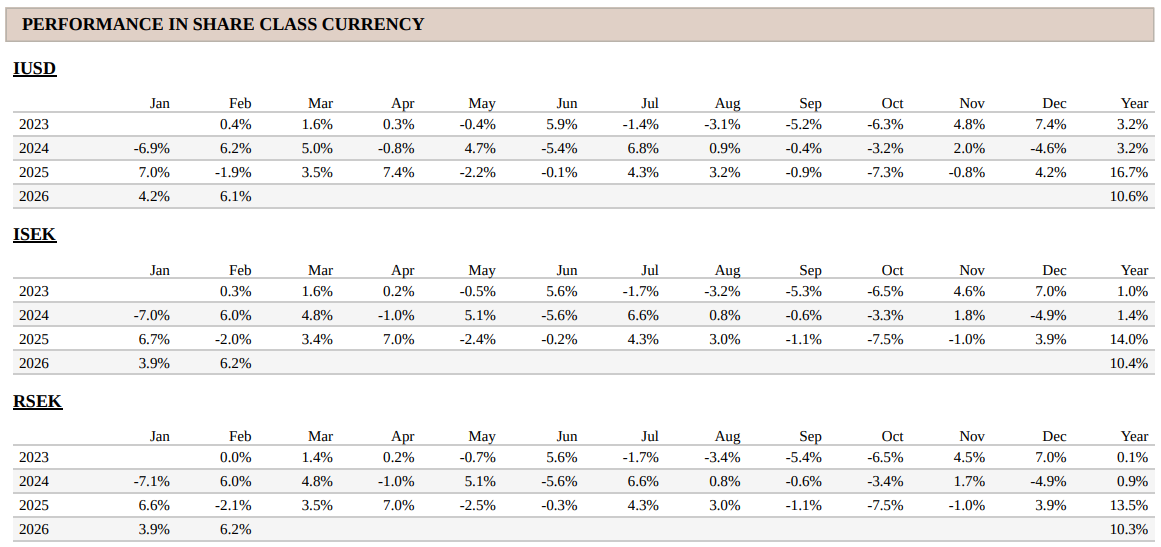 Note that the information below describes the share class (I USD), which is a share class reserved for institutional investors. Investments in other share classes generally have other conditions regarding, among other things, fees, which affects the share class return. The information below regarding returns therefore differs from the returns in other share classes.