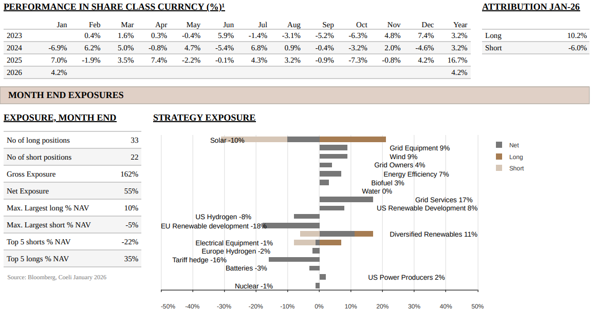 The Coeli Energy Opportunities fund gained 4.2% net of fees and expenses in January (I USD share class). The fund is up 29.4% since inception in February 2023.