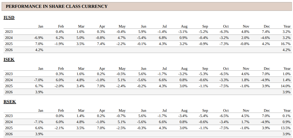 Note that the information below describes the share class (I USD), which is a share class reserved for institutional investors. Investments in other share classes generally have other conditions regarding, among other things, fees, which affects the share class return. The information below regarding returns therefore differs from the returns in other share classes.