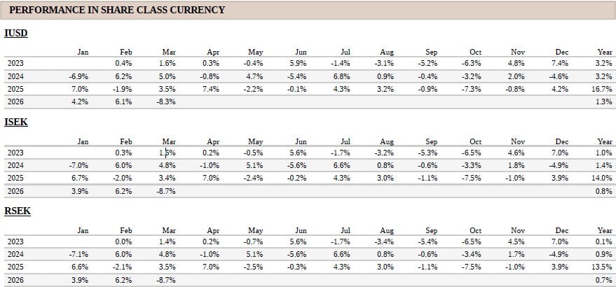 Looking further ahead, we believe the Iran war will only reinforce the focus on energy security and independence. That implies more renewables, more electrification and a larger, stronger grid. Combined with our still constructive view on AI‑driven demand, where appetite for compute continues to outgrow supply, we remain optimistic about our long positions in power and infrastructure companies. At the same time, we will continue to build and adjust hedges and short positions to manage downside risk and prepare for the next leg of this trade.